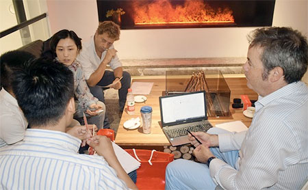 活動還特別設(shè)置了油畫創(chuàng)作環(huán)節(jié),讓設(shè)計師們在繁忙的工作之余獲得身心的愉悅。李鷹先生、伊瓦諾先生和藝術(shù)家CAMILO CADENA先生、郁一一女士藝術(shù)家圍坐在圓形壁爐上認(rèn)真創(chuàng)作,仿佛置身于戶外大自然中,獲得了靈感與創(chuàng)意的來源。